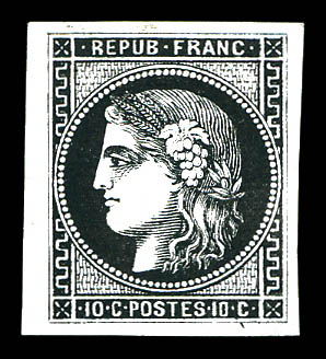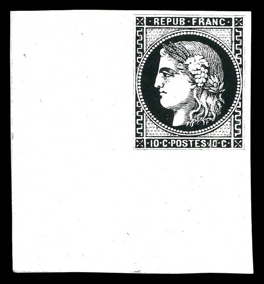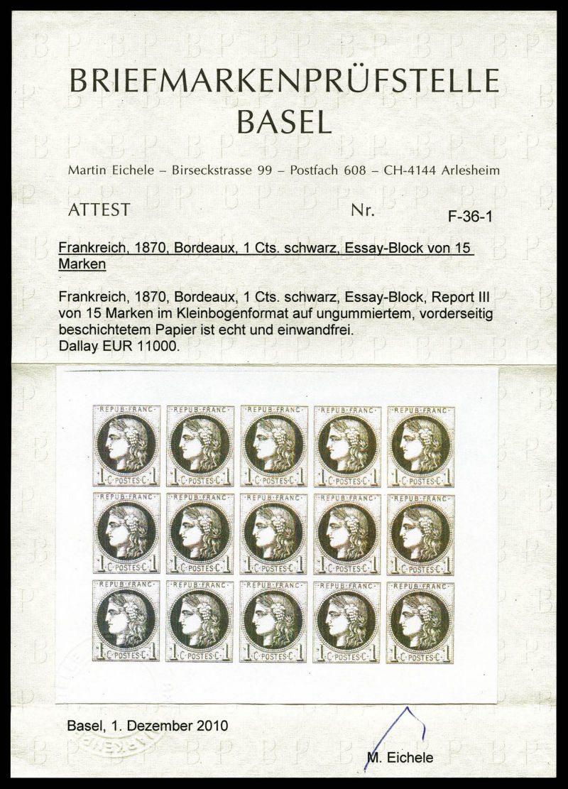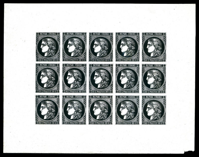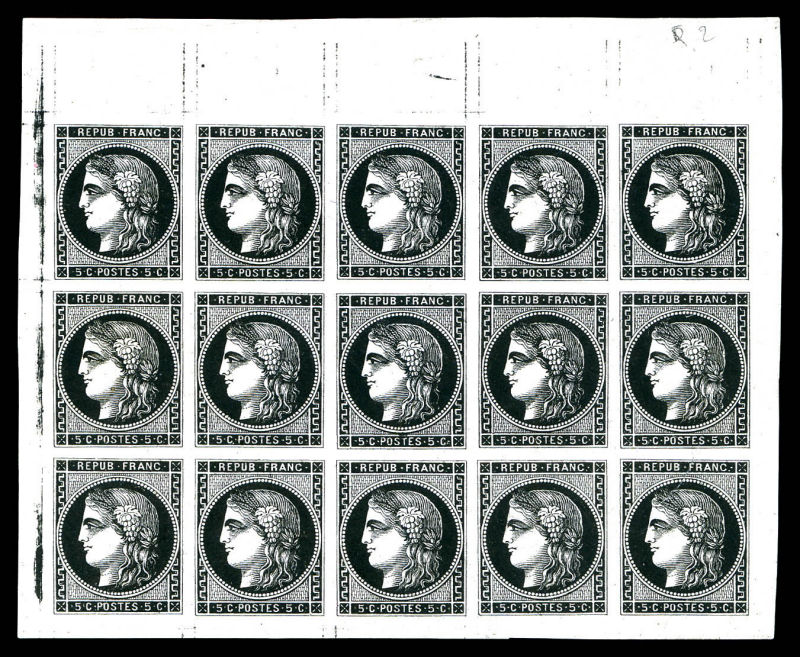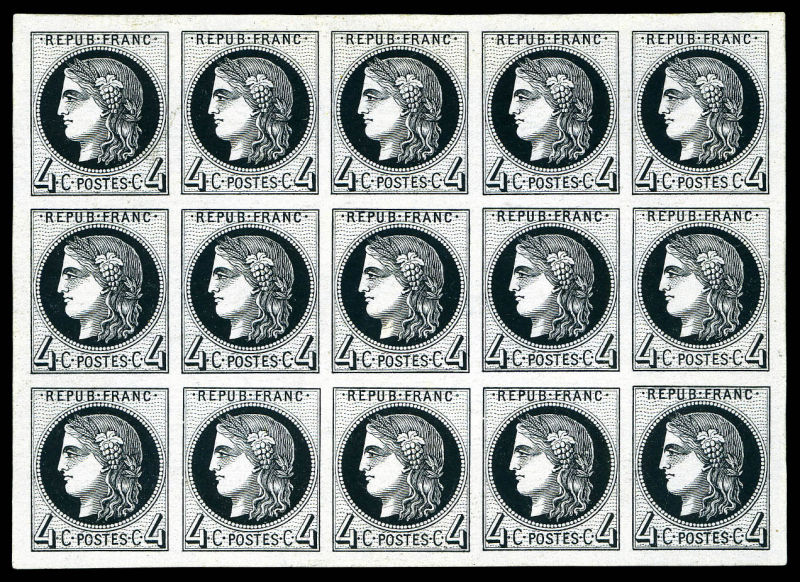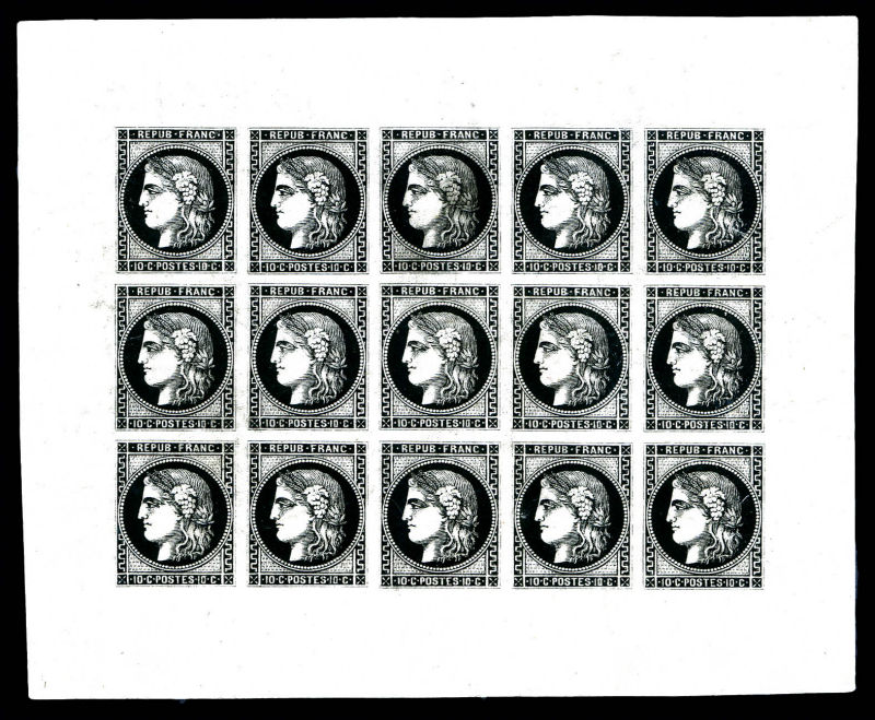 1374 imageN°43B, 10c Bordeaux Type II, essai en noir, bloc report complet de 15 exemplaires. R.R.R. SUPERBE (certificat) Qualité: (*) Cote: 20000 euros (Image)