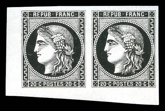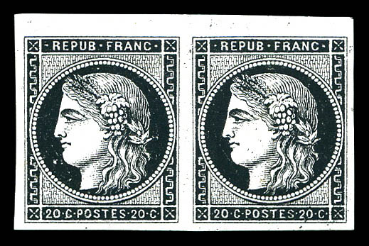 1379 imageN°46B, 20c Bordeaux type III Rep 2, essai en noir en paire cdf. TTB (signé Brun/certificat) Qualité: (*) Cote: 1000 euros (Image)