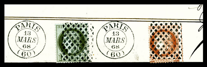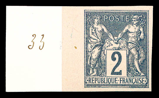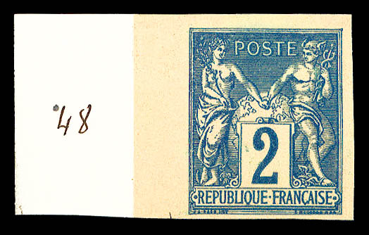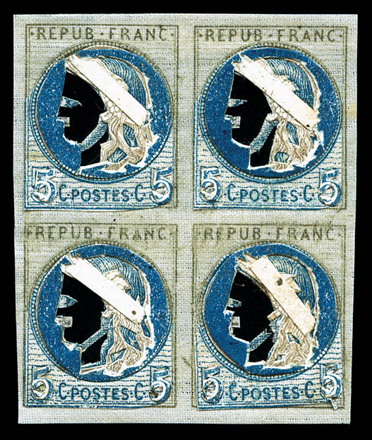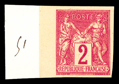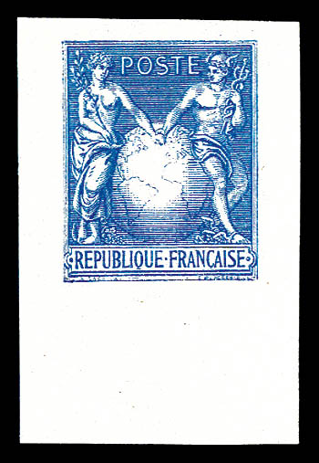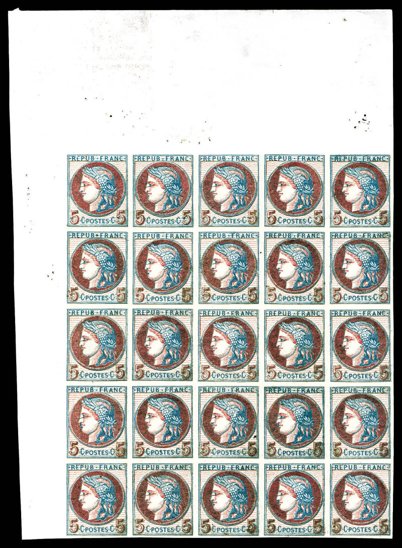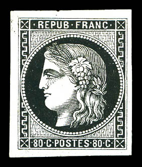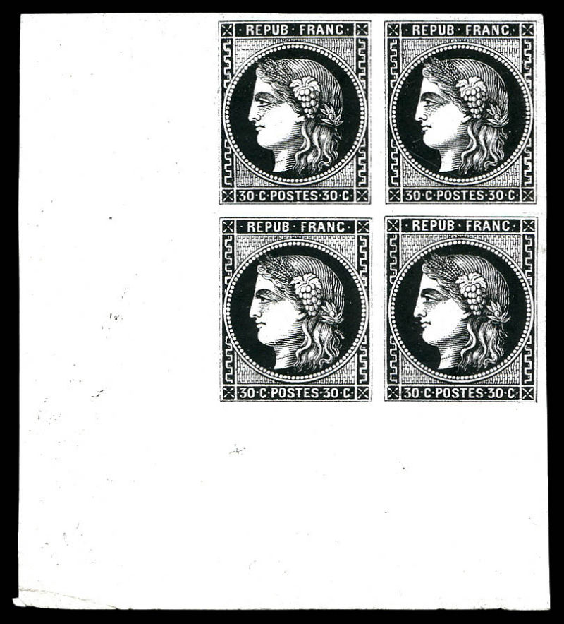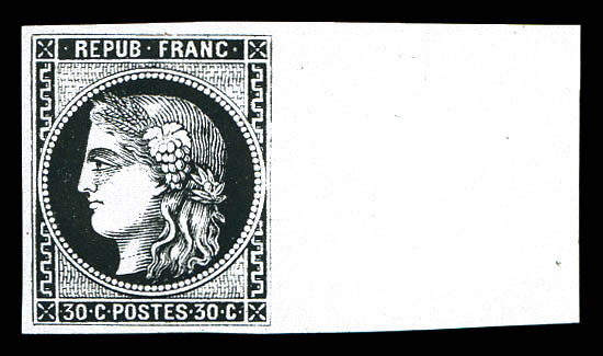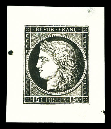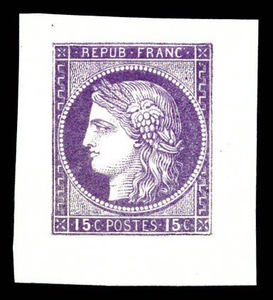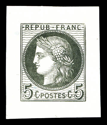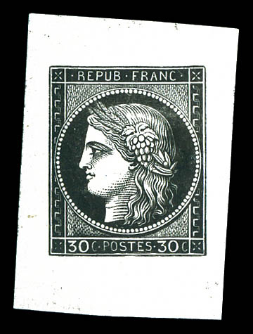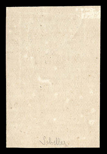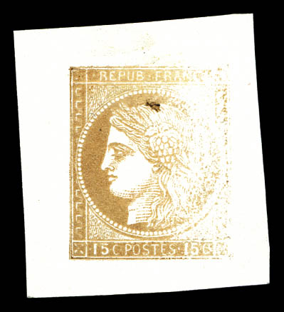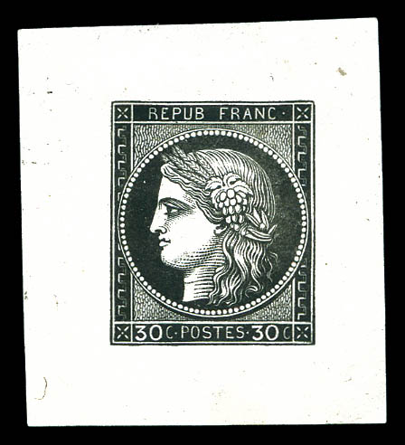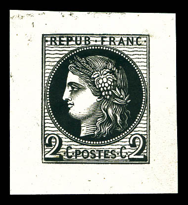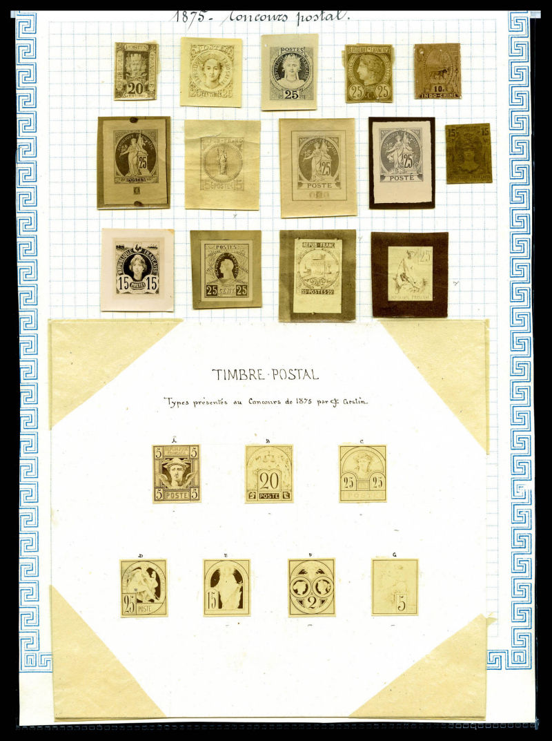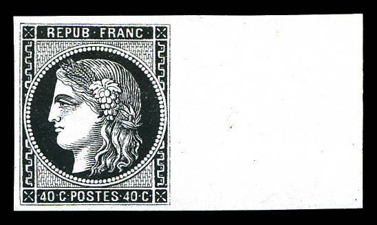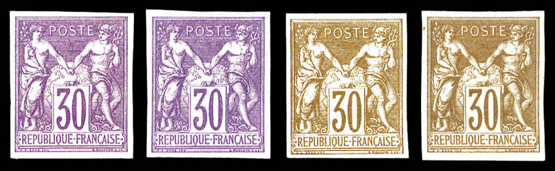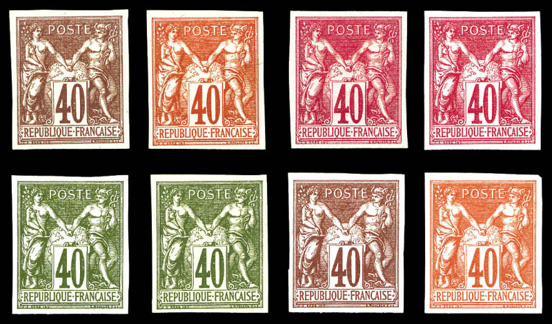 40c type I, ensemble de 8 essais sur papier normal de couleurs différentes, avec et sans teinte de fond (brun-lilas, rouge orange, carmin... SUPERBE. R.R. (signés Scheller/Certificat) Qualité: (*) (Image)