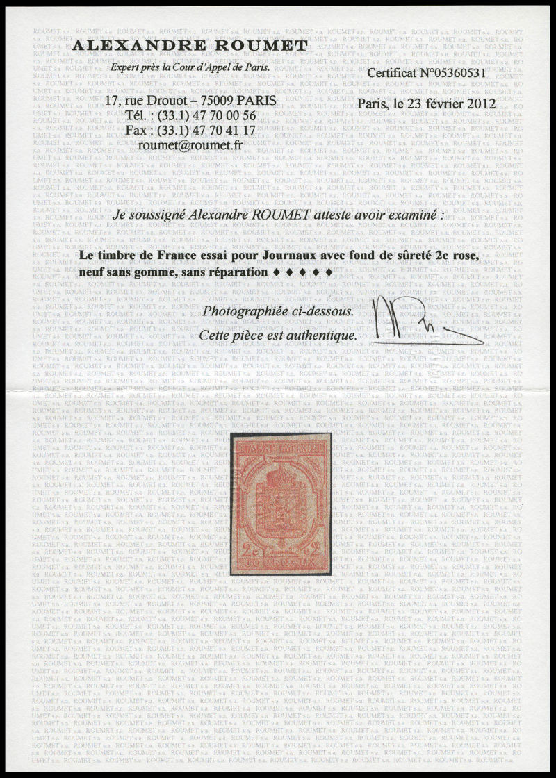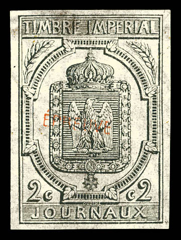 1458 imageN°1A, 2c, essai en noir non dentelé surchargé 'EPREUVE' en rouge, RARE (certificat) (références Maury) Qualité: * Cote: 2250 euros (Image)