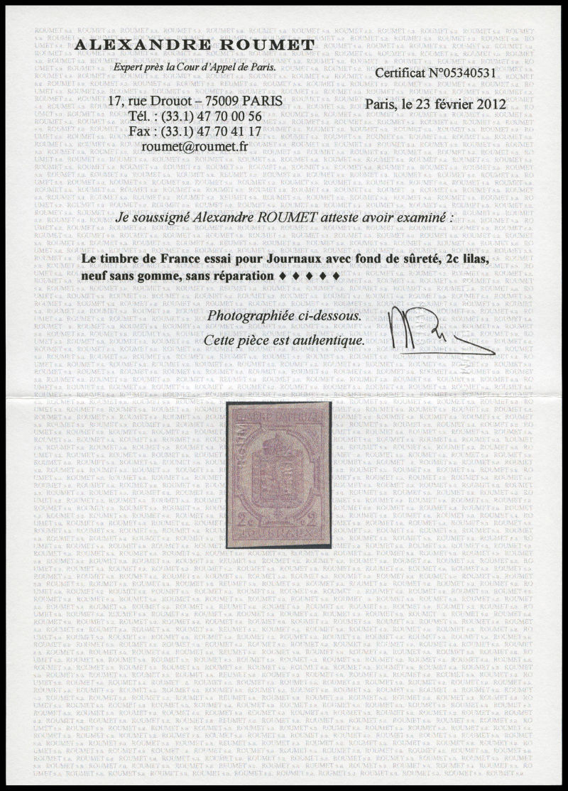 1457 imageN°1, 2c lilas non dentelé, impression sur la gomme, rare et superbe (certificat) Qualité: ** (Image)