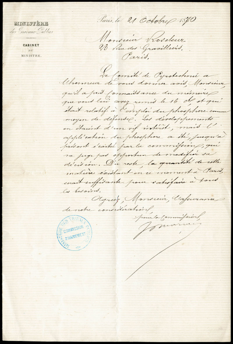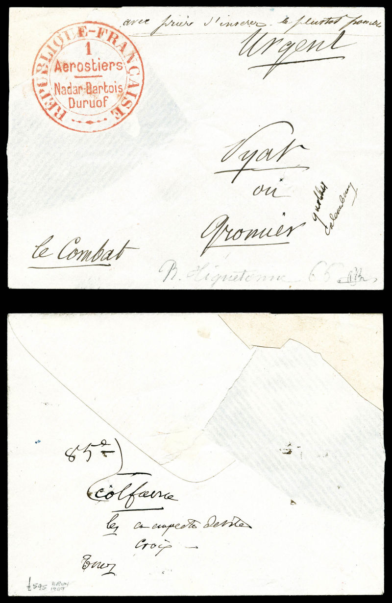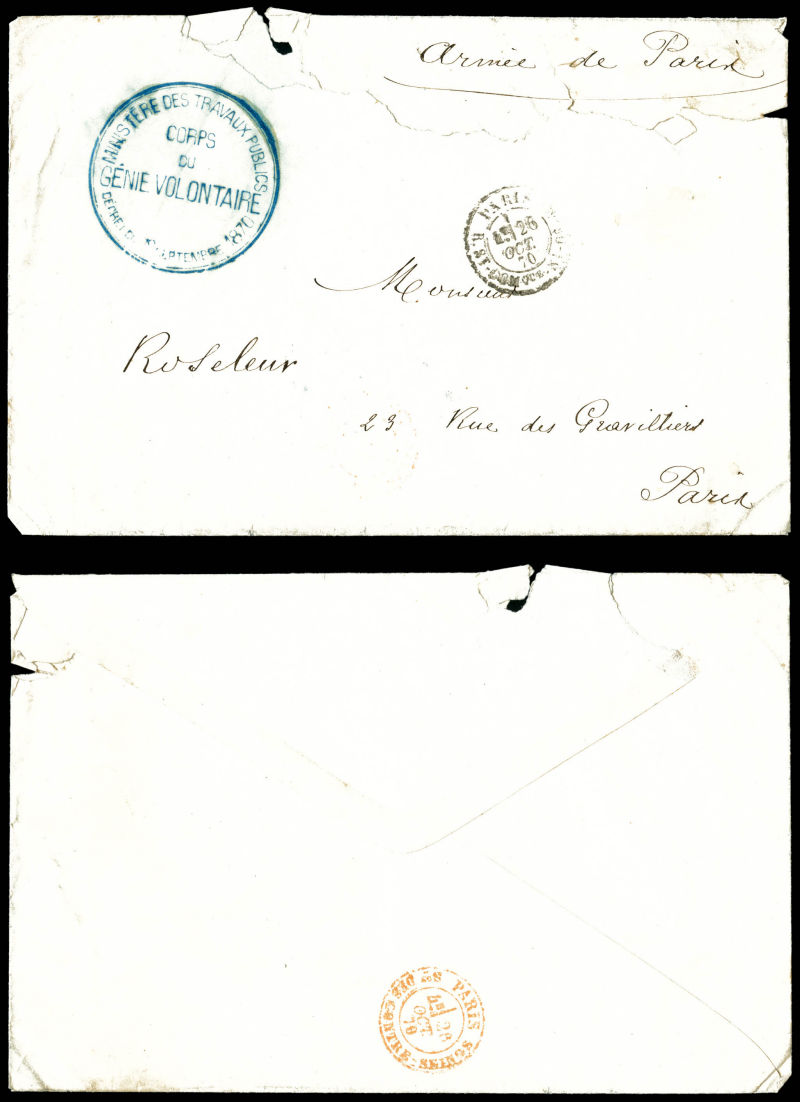 DES GRAVILLIERS, Lettre avec texte de Paris le 12 novembre 1870 adressée par Alfred Roseleur à sa femme à Aubusson (Creuse) à l'aide d'un petit ballonnet privé laché depuis sa fenêtre du 23 rue des Gravilliers, mention manuscrite 'Prière de mettre à