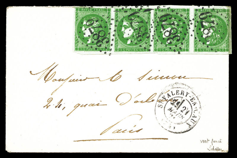 1565 imageN°42Bi, Commune, 5c vert foncé en bande de quatre OB GC 3879, C. ST VALERY-EN-CAUX sur enveloppe pour Paris 21 mars 1871. TTB (signé Scheller/certificat) (références Maury) Qualité: Oblitéré Cote: 4000 euros (Image)
