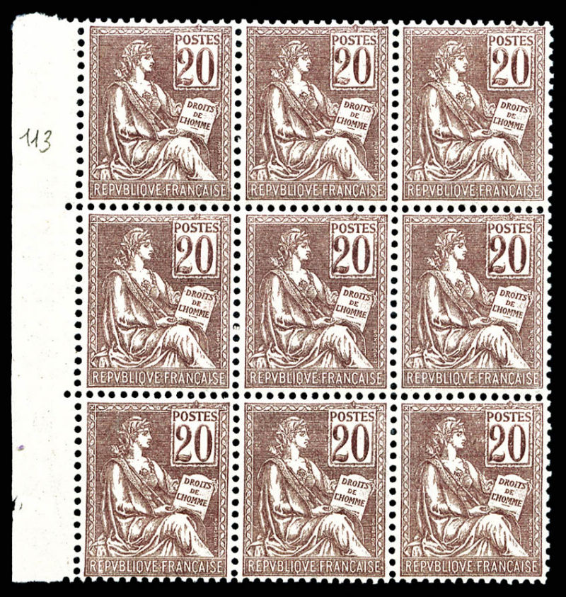 1575 imageN°113, 20c brun-lilas, bloc de neuf bdf, très bon centrage, SUP (certificat) Qualité: ** Cote: 4050 euros (Image)