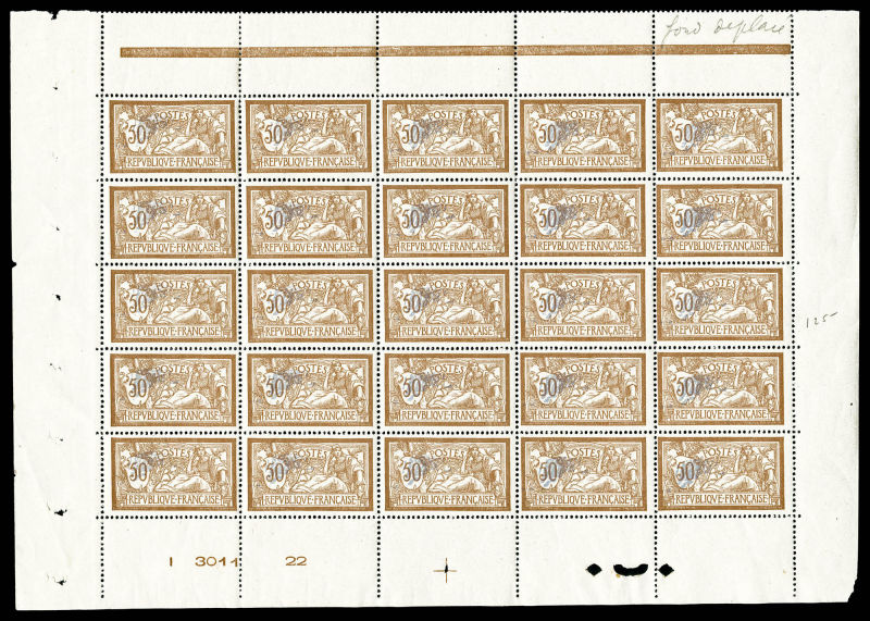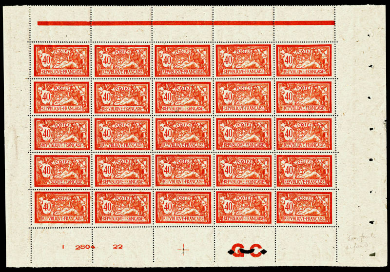 rouge sans teinte de fond, feuille de 25 exemplaires avec manchette 'GC', croix de repère et numéro, très bon centrage, probablement unique, SUPERBE (certificat) Qualité: ** Cote: 20000+ euros (Image)