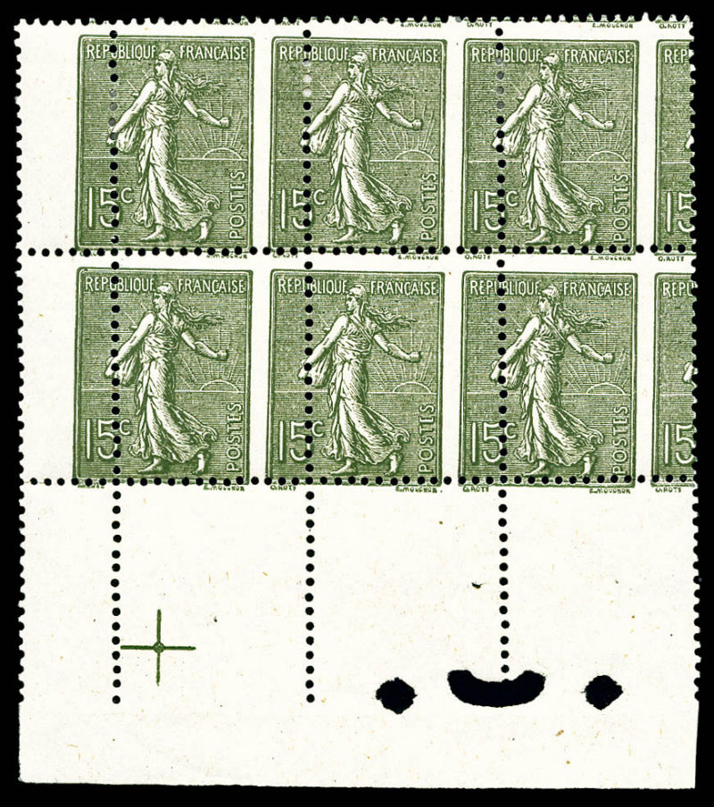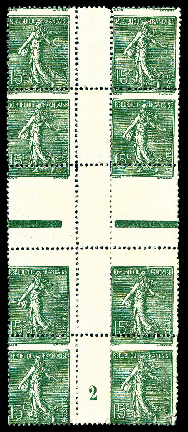 1646 imageN°130, 15c Semeuse, bloc de 10 exemplaires non dentelé en partie inférieure, bas de feuille numéroté avec perforation de contrôle et croix de repère. SUP. R. (certificat) Qualité: ** (Image)