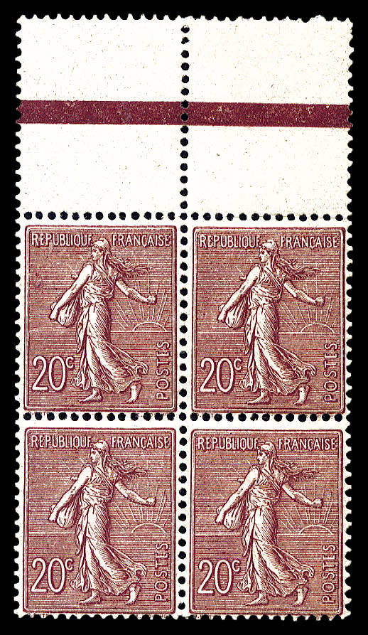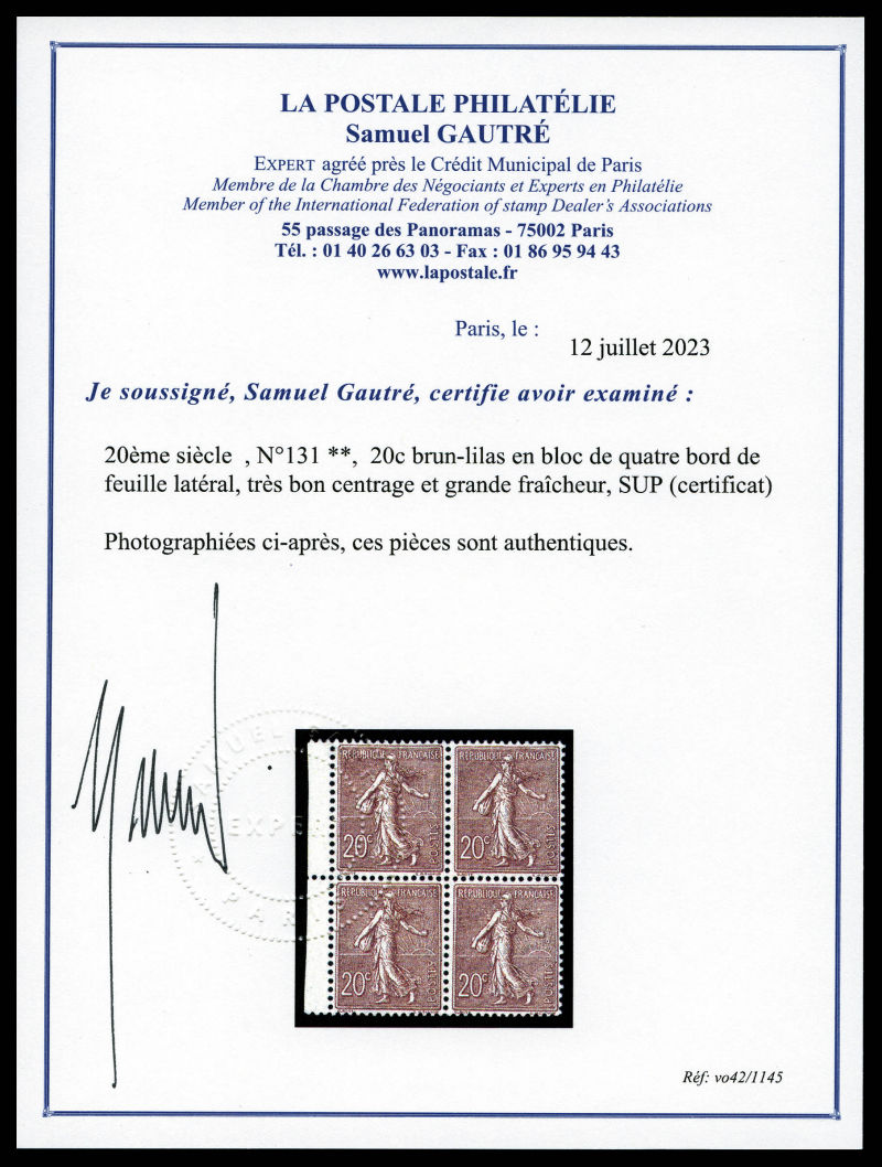 1651 imageN°131, 20c brun-lilas en bloc de quatre bord de feuille latéral, très bon centrage et grande fraîcheur, SUP (certificat) Qualité: ** Cote: 1600 euros (Image) (image2) (All Images)