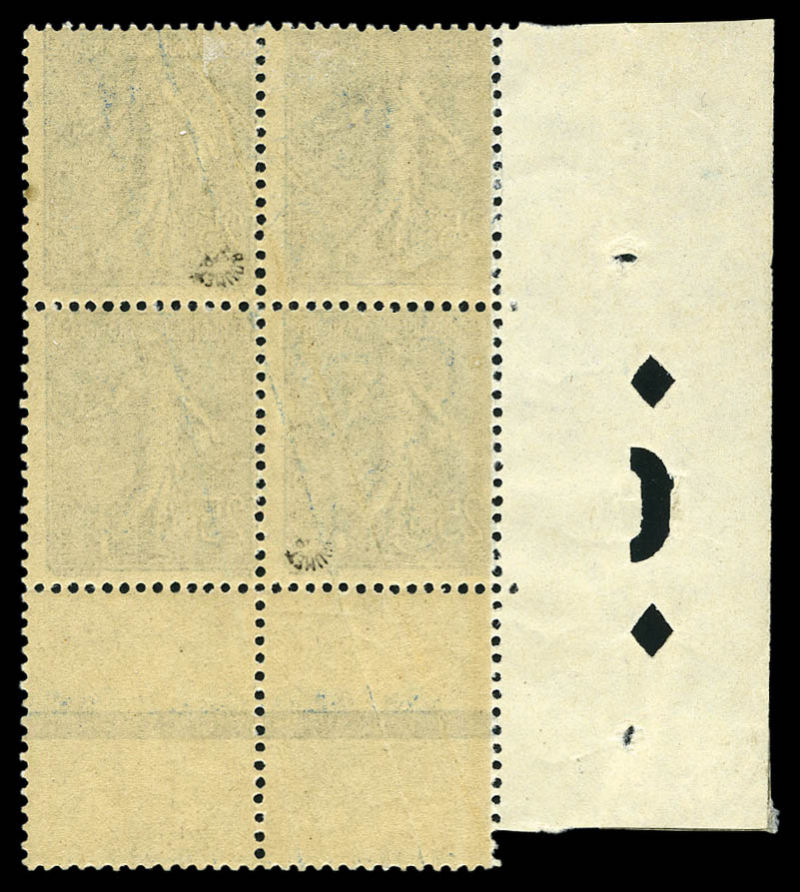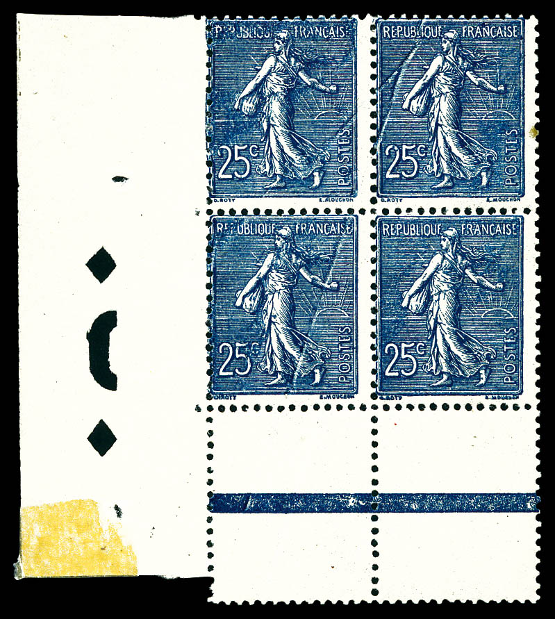 1658 imageN°132a, 25c Semeuse bleu foncé, spectaculaires variétés de pli accordéon ainsi que de déformation de l’impression sur bloc de quatre cdf. SUP (signé/certificat) Qualité: ** (Image) (image2) (All Images)