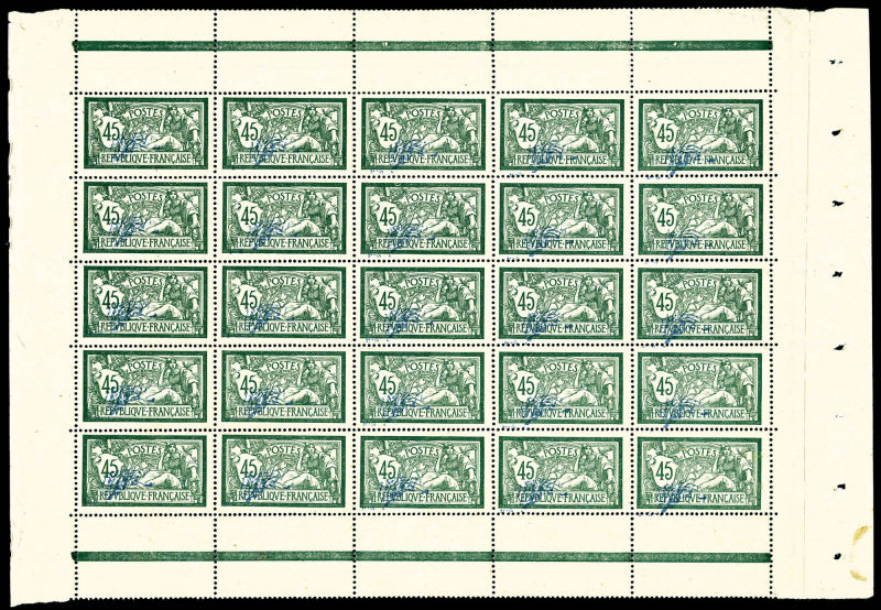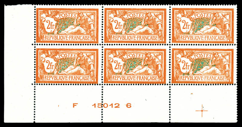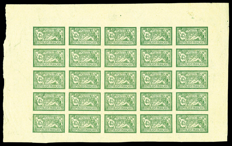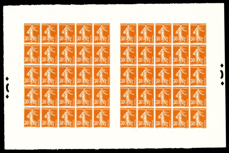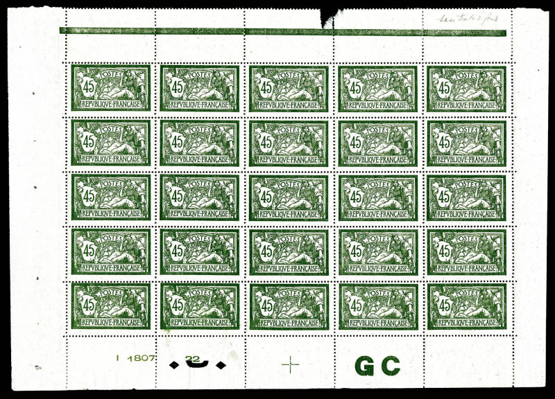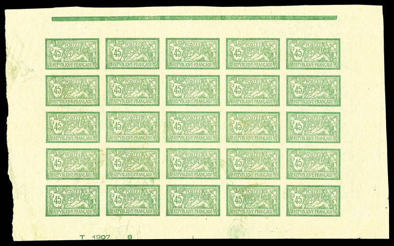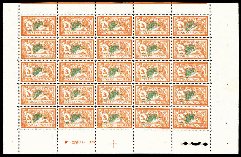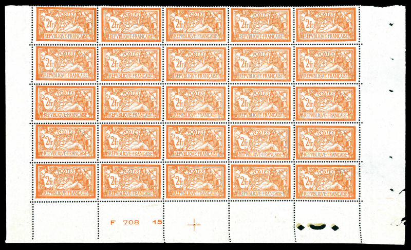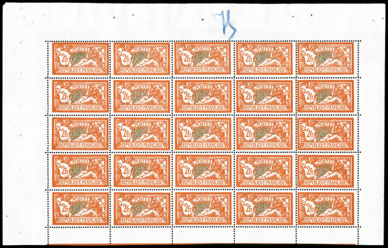 Merson, 2f orange, SANS teinte de fond, panneau complet de 25 exemplaires avec croix de repère, perforation de contrôle et numéro. SUP. R.R. (certificats) Qualité: ** Cote: 15000 euros (Image)