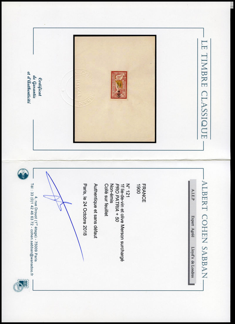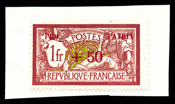 1723 imageMaury N°3E, Non émis: Merson 1F +50c lie de vin et olive surchargé 'PRO PATRIA' en rouge sur feuillet de présentation, SEULE PIECE CONNUE. SUPERBE (certificat) Qualité: (*) Cote: 13500 euros (Image)