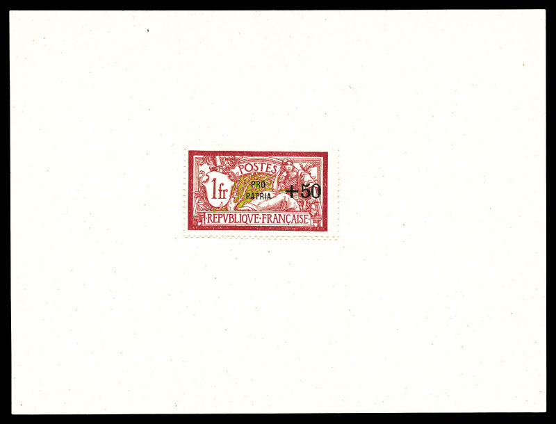 1724 imageMaury N°3G, Non émis: Merson 1f +50 surchargé 'PRO PATRIA' en noir sur feuillet de présentation, SEULE PIECE CONNUE. SUPERBE (certificats) Qualité: (*) Cote: 13500 euros (Image) (image2) (All Images)