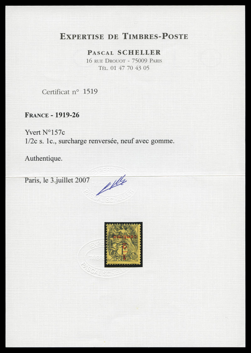 1728 imageN°157c, 1/2 sur 1c ardoise papier GC: SURCHARGE RENVERSEE, SUPERBE (certificats) Qualité: ** Cote: 2500 euros (Image) (image2) (image3) (All Images)