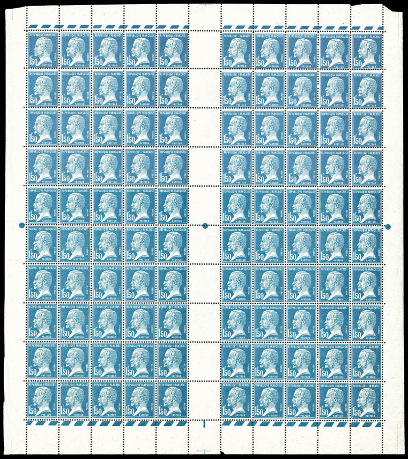 1733 imageN°181a, Pasteur, 1F50 bleu: faux de Marseille en feuille complète de 100 exemplaires, RARE (certificat) Qualité: ** Cote: 5000 euros (Image)