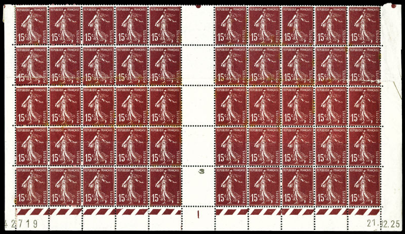 1750 imageN°189, 15c Semeuse: impression sur raccord en panneau de 50 exemplaires bas de feuille daté, quelques points roux sur la gomme sinon TB Qualité: * Cote: 1200 euros (Image)