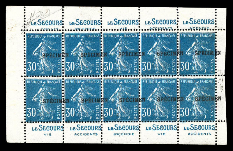 1752 imageN°192-CI 2, 30c Semeuse, surcharge 'SPECIMEN' à cheval sur bloc complet de 10 exemplaires provenant de carnet. SUP (signé Brun/certificat) Qualité: ** (Image)