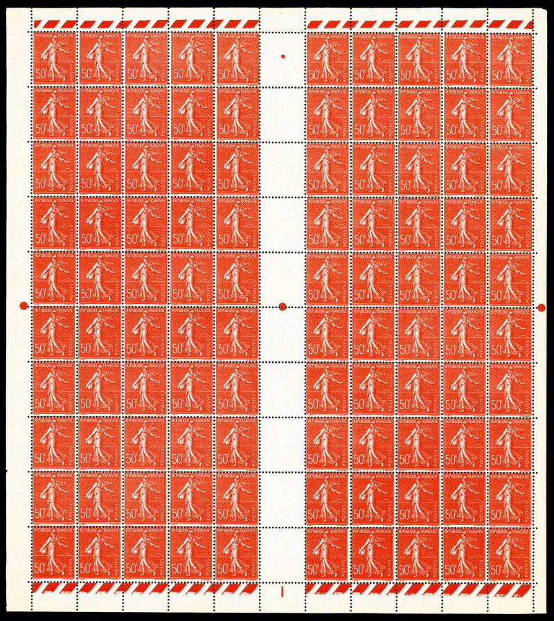 1756 imageN°199n, Semeuse, 50c rouge: FAUX DE MARSEILLE en feuille complète de 100 exemplaires, RARE (certificat) Qualité: ** Cote: 5500 euros (Image)