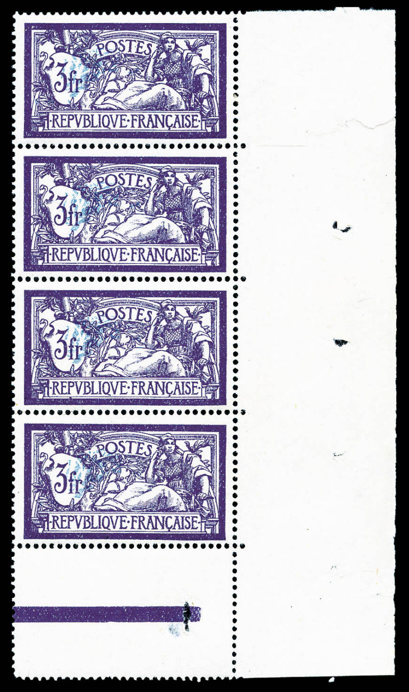 1761 imageN°206c, 3F violet et bleu, CENTRE DEPLACE en bande de quatre coin de feuille, très bon centrage, SUP (certificat) Qualité: ** Cote: 2250 euros (Image)