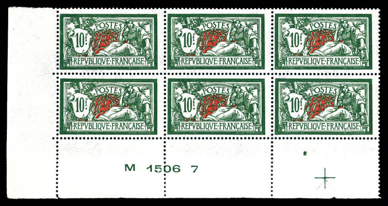 1763 imageN°207, Merson, 10f vert et rouge en bloc de six coin de feuille avec croix de repère et numéro. SUPERBE (certificat) Qualité: ** Cote: 2400 euros (Image)