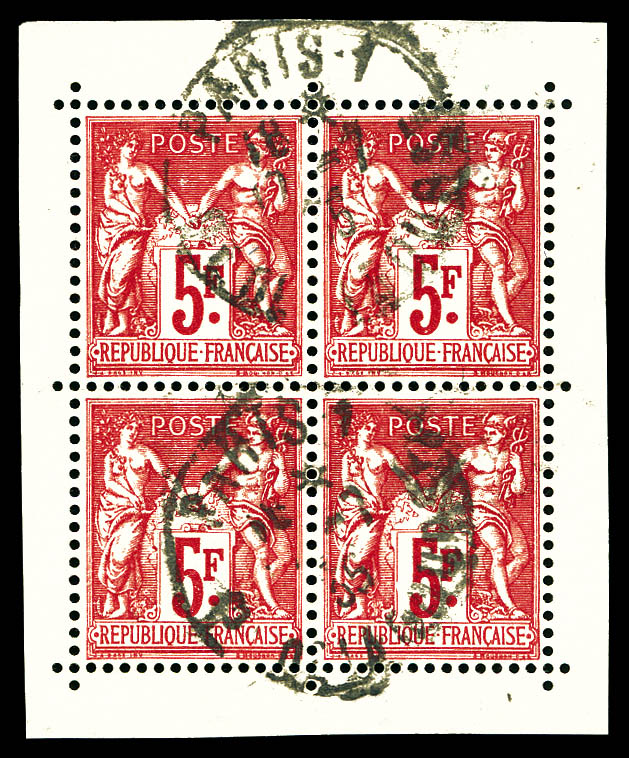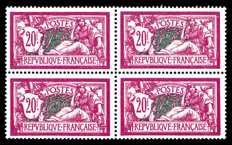 1767 imageN°208, 20f Merson en bloc de quatre, très bon centrage. SUP (certificat) Qualité: ** Cote: 3600 euros (Image)