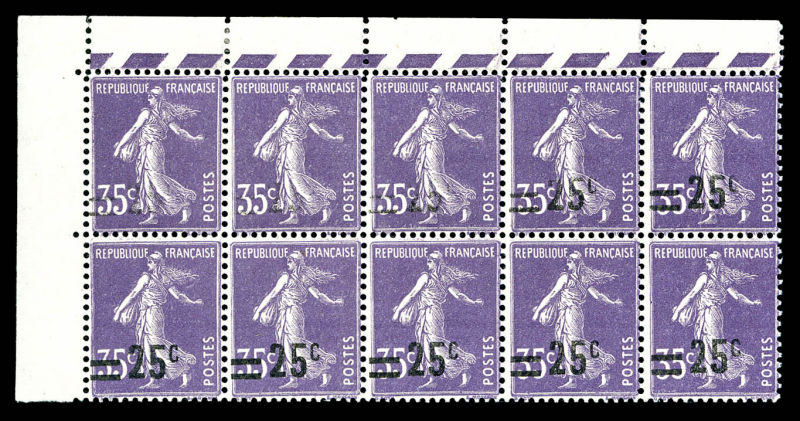 1780 imageN°218c, 25c sur 35c Semeuse, surcharge absente sur 3 exemplaires tenant à normaux en bloc de 10 exemplaires cdf. SUPERBE. R.R (certificat) Qualité: ** Cote: 3300 euros (Image)