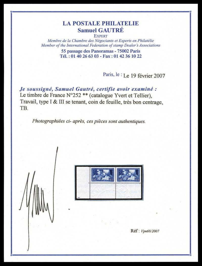 1806 imageN°252/b, Travail, type I et III se tenant, coin de feuille, très bon centrage, TB (certificat) Qualité: ** Cote: 624 euros (Image) (image2) (All Images)