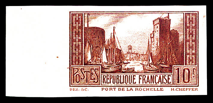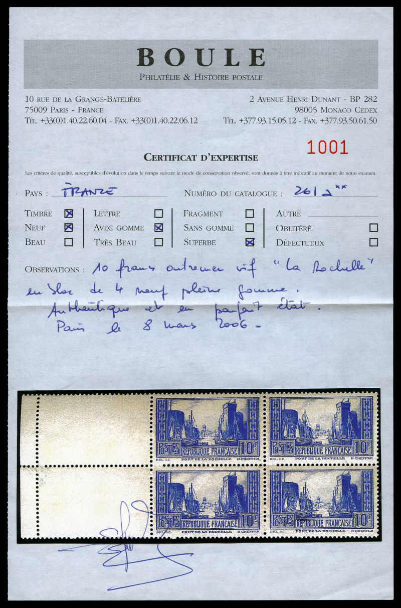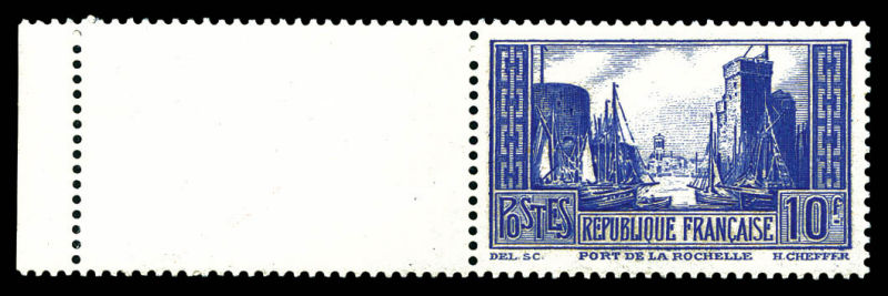 émis: Port de La Rochelle, 10F OUTREMER VIF type III bord de feuille latéral gauche, TRES BON CENTRAGE, GRANDE RARETE du XXème siècle, SUPERBE (signé Brun/Calves/certificat) Qualité: ** (Image) (image2)