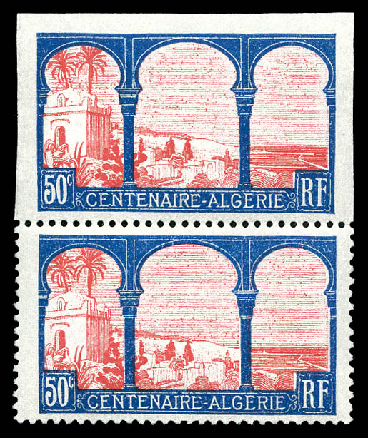 1862 imageN°263c, Centenaire de l'Algérie francaise: Non dentelé tenant à dentelé. Moins de 10 paires possibles, Fraicheur postale SUPERBE. R.R.R. (signé Calves/certificat) Qualité: ** Cote: 7000 euros (Image)