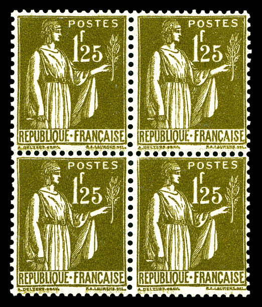 1876 imageN°287, Paix, 1F 25 olive en bloc de quatre, très bon centrage (certificat) Qualité: ** Cote: 1118 euros (Image)