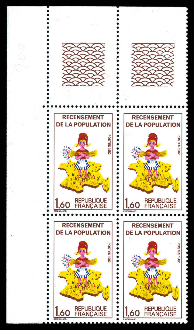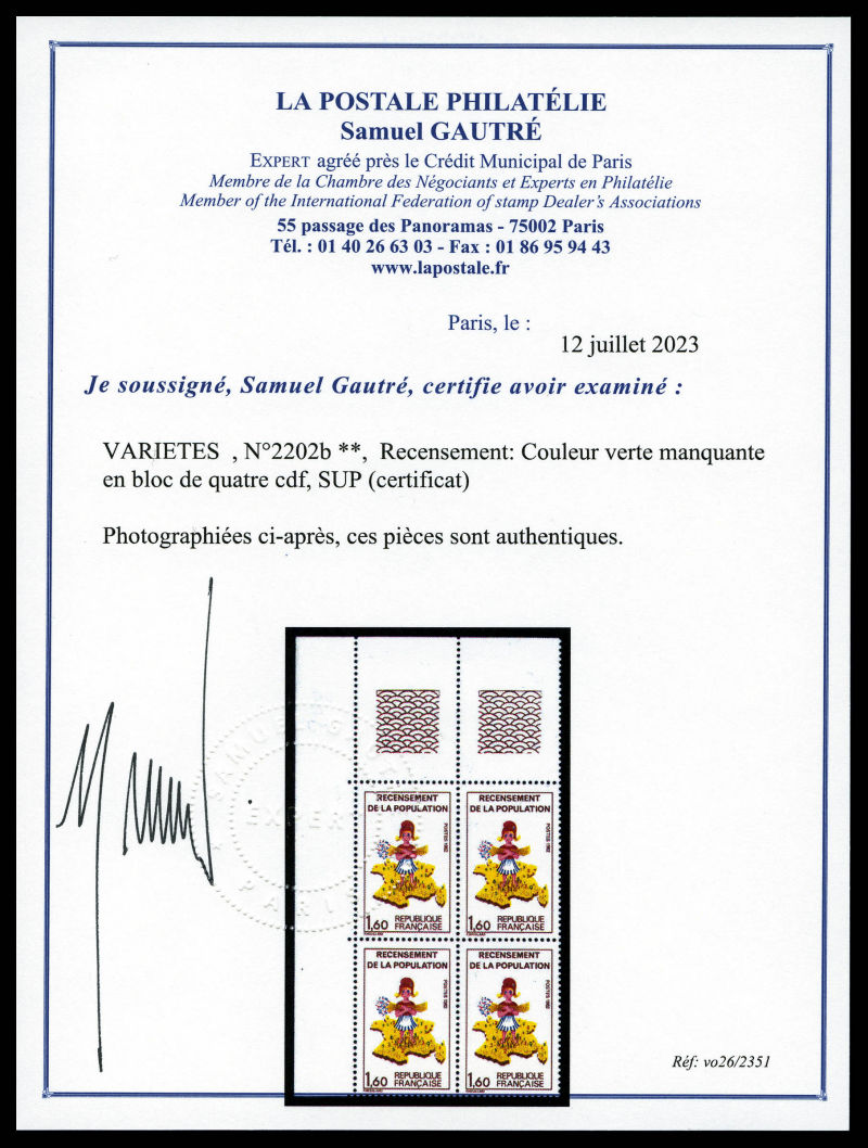 1967 imageN°2202b, Recensement: Couleur verte manquante en bloc de quatre cdf, SUP (certificat) Qualité: ** Cote: 2140 euros (Image) (image2) (All Images)