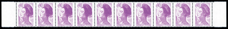 1970 imageN°2242a, 90c Liberté, 8 ex bonnet maculé tenant à 2 normaux en bande de 10 exemplaires. TTB (signé Calves) Qualité: ** Cote: 630 euros (Image)