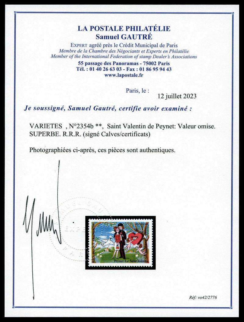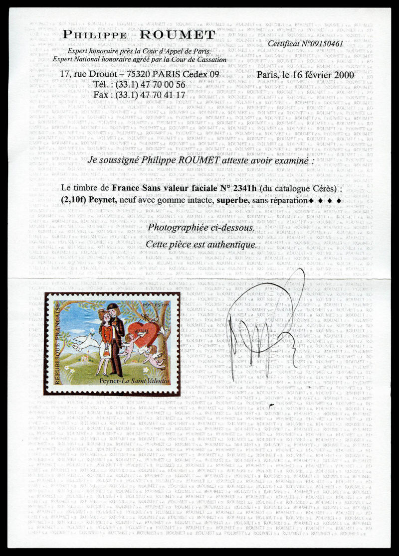 1972 imageN°2354b, Saint Valentin de Peynet: Valeur omise. SUPERBE. R.R.R. (signé Calves/certificats) Qualité: ** Cote: 17500 euros (Image) (image2) (image3) (All Images)