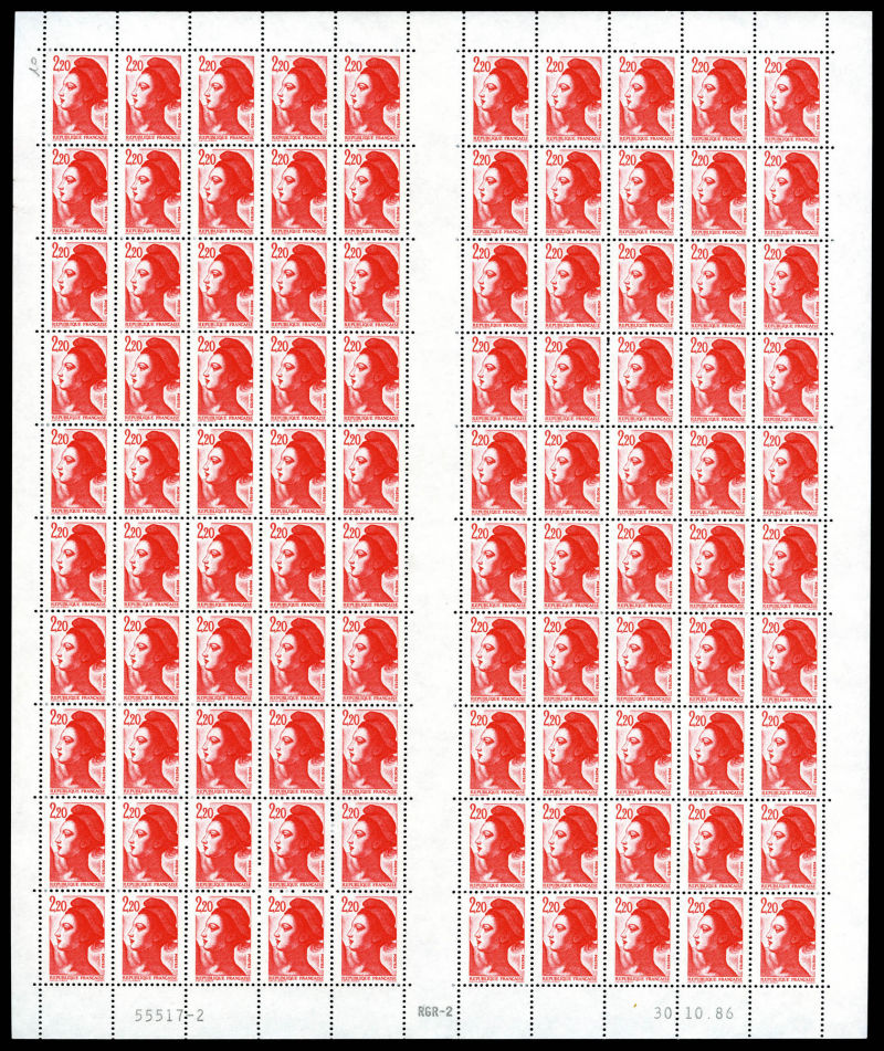 1973 imageN°2376, 2,20f Liberté, 1er Tirage RGR-2 en feuille complète de 100 exemplaires datée du 30.10.86. TTB (certificat) Qualité: ** (Image)