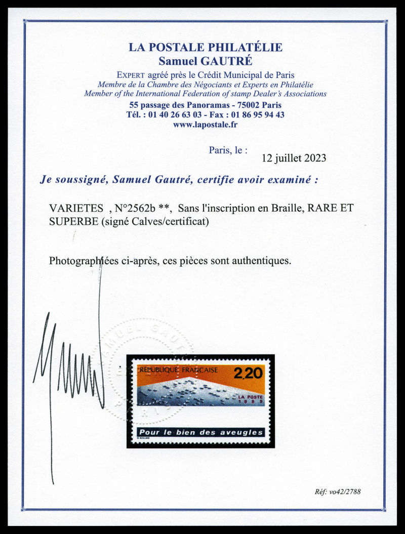 1977 imageN°2562b, Sans l'inscription en Braille, RARE ET SUPERBE (signé Calves/certificat) Qualité: ** Cote: 3500 euros (Image) (image2) (All Images)