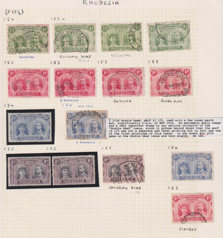 212 / imageRhodesia 1910-13 ½d – 2/- Double Heads p15 mint & used range of 61v on 4 pages. ½d x 10 u; 1d x 19 u; 2d x 4 u; 2½d x 2 m & 4 u; 3d x 3 u [incl SG 173 with BPA (1987) certificate]; 4d MUH (with King’s extra eyebrow variety) & 3 u; 5d x 5 u incl unique (o (Image)