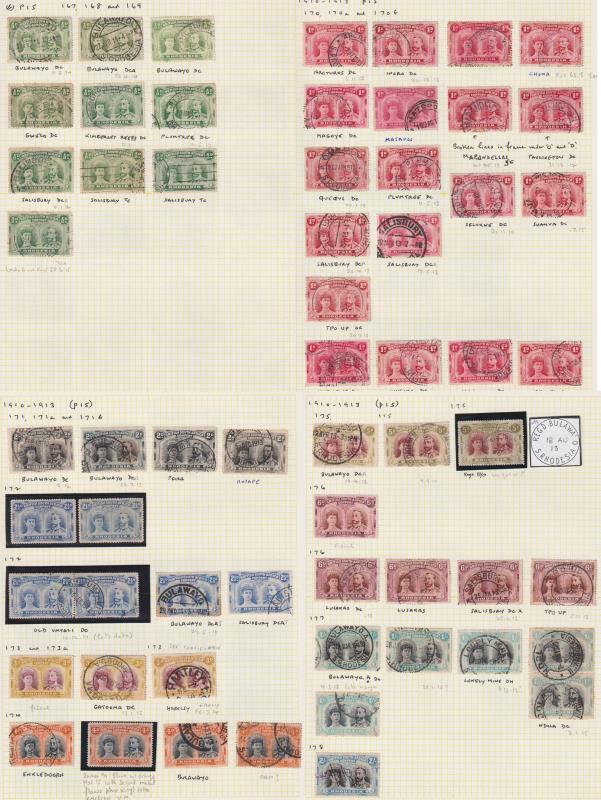 213 / imageRhodesia 1910-13 ½d - £1 Double Heads p14 magnificent range of 453v on 26 pages, numerous shades, mint & used + odd fiscal. ½d x 54; 1d x 162; 2d x 24; 2½d x 32; 3d x 30 incl unlisted SG maroon & ochre shade mint; 4d x 19; 5d x 18 incl SG141ab x 5 used [ (Image)