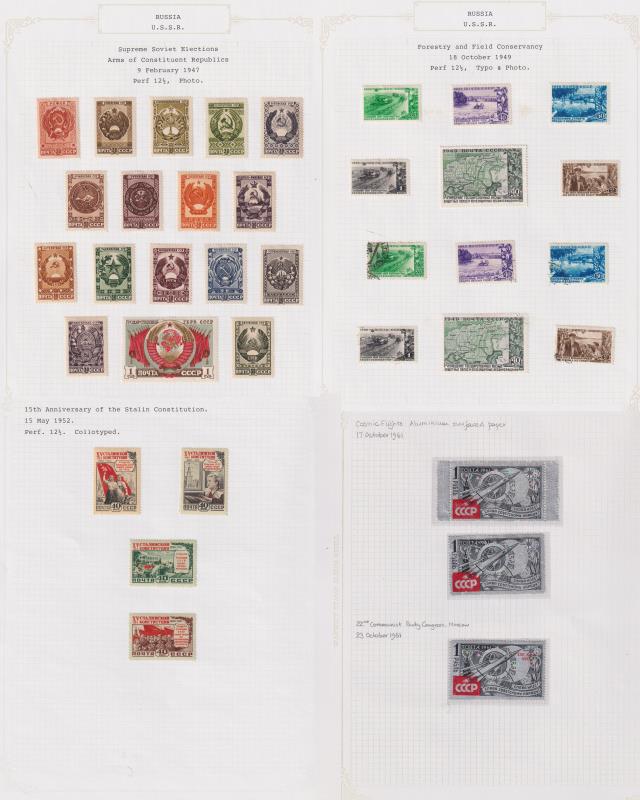 222 / imageRussia 1945-69 mint & used reasonably complete colln, on pages, with some covers, dupn + misc loose in packets. Strength lies in the immediate post war album - this alone cat £4850+. Noted 1952 Stalin Constitution mint set, & 1961 Cosmic Flights (alumin (Image)