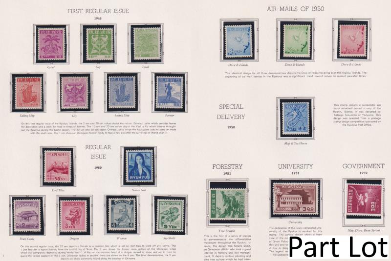 224 M* imageRyukyu Isl 1948-72 virtual complete mint colln in mounts on illustrated White Ace album pages. Noted 1950 Airmail set of 3 & 1952 3y Ryukyuan Govt establishment mint. Also incl 2 FFCs & 8 FDCs. Cat £1200+. (Image)