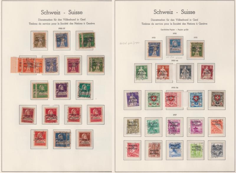 242 U imageSwitzerland-International Organisations 1922-c1990 apparently complete FU colln in mounts on dedicated printed pages in fine L/H springback album. Noted League of Nations 1922-37 2½c-10F ovpt set of 33 (cat approx £1200) & all later issues complete, incl (Image)