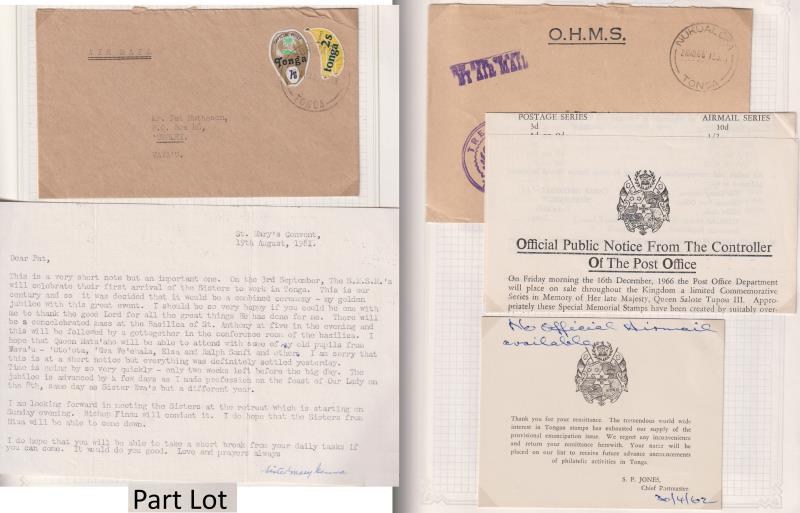 243 C imageTonga c1930s-90s interesting & unusual colln of 100+ covers on pages. Only a few items are philatelic (FDCs etc). Many items to local Tongan addresses (incl expats). Noted 1960s-80 "free-form" stamp frankings (40+); stampless official covers with vario (Image)