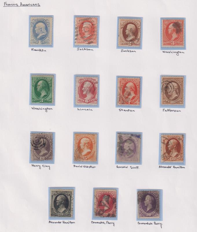 248 / imageUSA 1870 1c-90c Famous Americans colln, mainly used on 12 pages. Noted: several MNG incl both 90c; 12c x 23 (alone cat £5000+); 90c x 5; 13 covers incl 2 to NZ; various town & fancy cancels. Mixed condition. Inspection advised. Cat £10,500+. (Image)