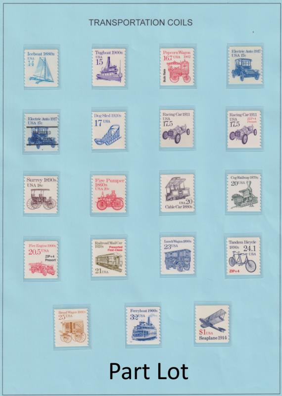 251 C* imageUSA 1981-1995 comprehensive transportation plate number coils colln on 156 annotated pages. Noted 9.3c Mail Wagon plate 5 & 6 strips of 3; 10.9c Hansom Cab precancel plates 3 & 4 strips of 3; 17c Electric Auto precancel "AB" plates 3 & 4 strips of 5. In (Image)