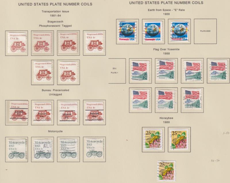 252 / imageUSA 1981-2003 comprehensive mint & used colln of over 600 diff plate number coils on 64 annotated pages. Noted 5.9c Bicycle precancel plates 5 & 6; 10.9c Hansom Cab precancel plates 3 & 4; 1991 29c blue, red & brown Flag over Mt Rushmore plate 7. Catalo (Image)