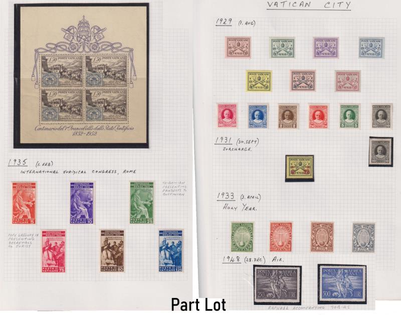 253 M* imageVatican 1929-66 near complete mint collection on album pages. Noted 1935 Judicial Congress set of 6 mint, Airmail (1948, 1949 & 1951) sets of 2 mint & 1952 Stamp Centenary m/s MUH. Some stamps firm hinging/pressure-stuck. Cat £4500+. (Image)