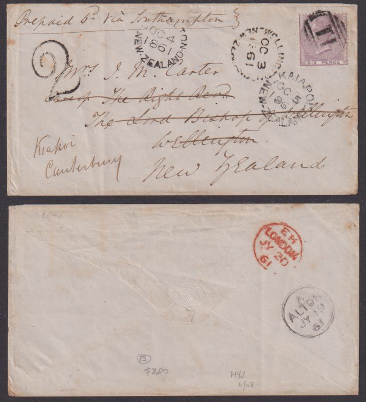 1861 cover ex GB, franked GU/FU 6d pale lilac SG 70 (cat £250 on cover), canc "11" obliterator, to Lord Bishop of Wellington,