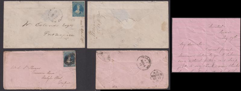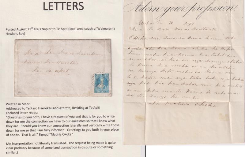 1863 Napier to Te Apiti cover and letter, addressed & written in Maori. Posted Aug 21st with 2d FFQ 2 margins. (Image)