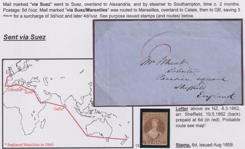 Galle-Suez-Gibraltar. Prepaid "6"d in red m/s. Also the 6d brown imperf (SG 13) stamp issued for the Suez route (mandatory use from 1862), 4