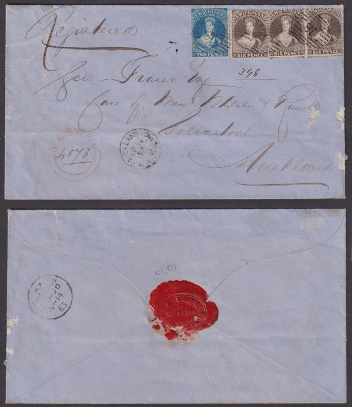 1863 Registered cover to Auckland, with 6d black-brown pair & single & 2d deep blue, all p13. "18" barred oval cancel,