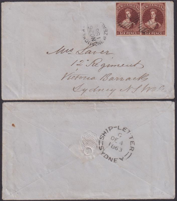 1863 (26 Nov) envelope ex Laver correspondence from Auckland, to his wife at Victoria Barracks, Sydney, bearing 6d red-brown