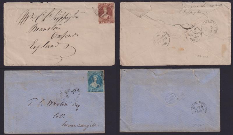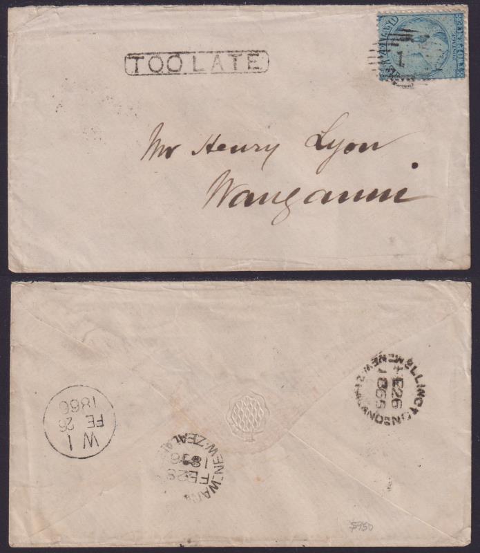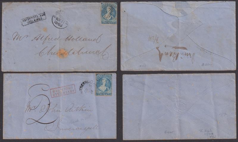 good unframed cds SP 26 as b/s) to Invercargill (weak "Invercargill/New Zealand" unframed cds [on front] OC 8 63). Also 1868 cov