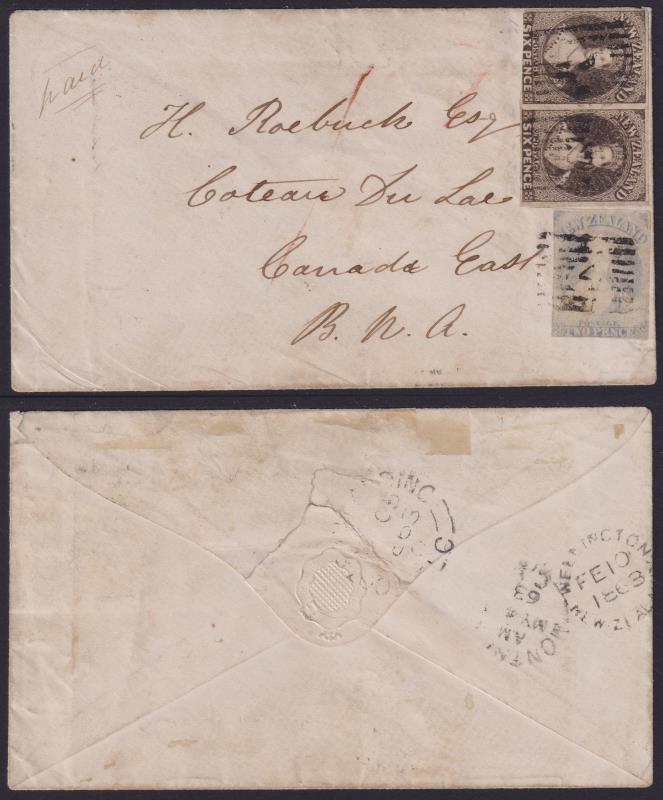 1863 Wellington to Canada cover, with 2d pale ultramarine, 6d black-brown horiz pair, Pelures, cancelled barred "4" oblong